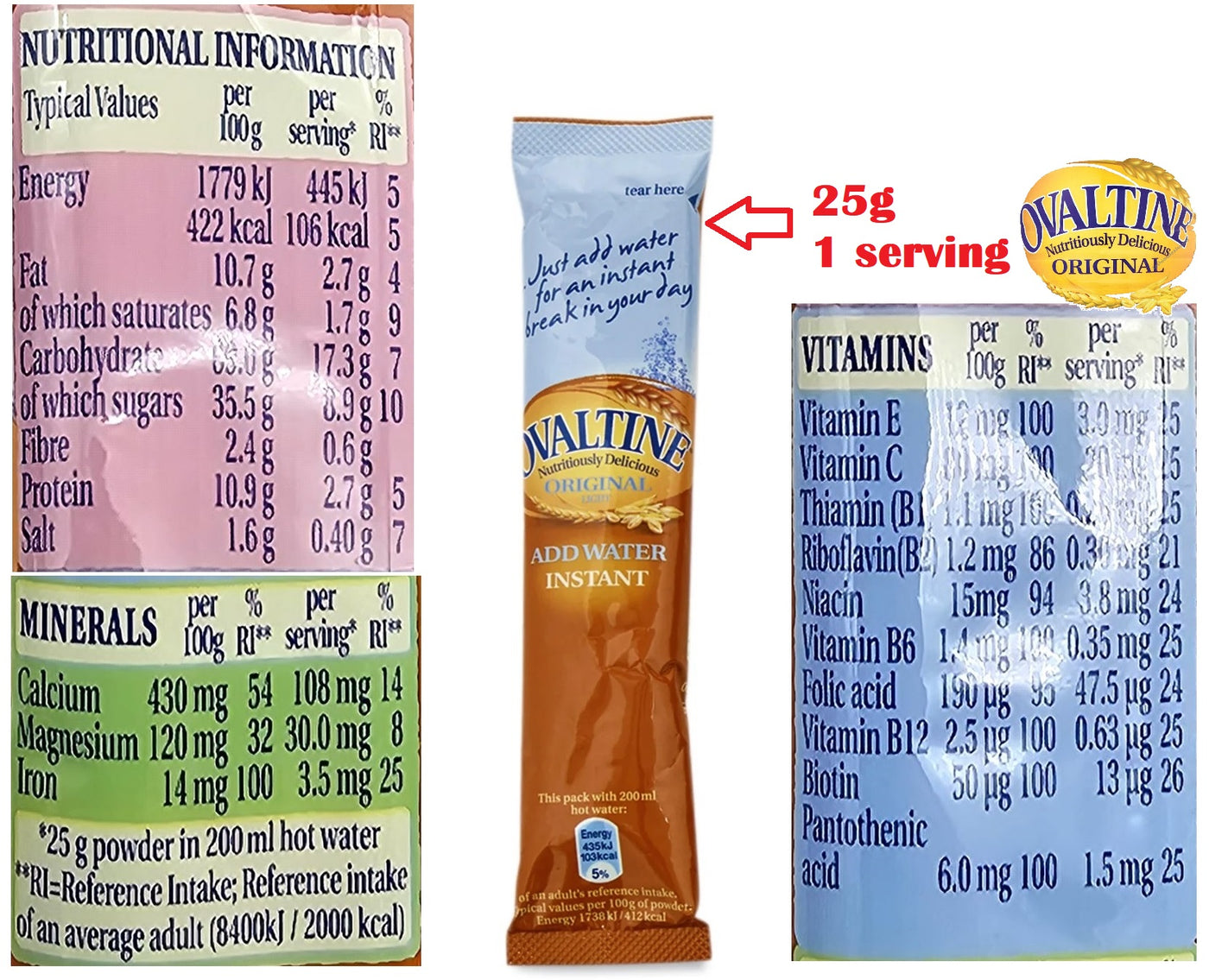 Ovaltine Original Light delivers the familiar malty cocoa flavour you love, with added vitamins and minerals including iron and B-vitamins. Each serving provides approximately 106 kcal when prepared with water.