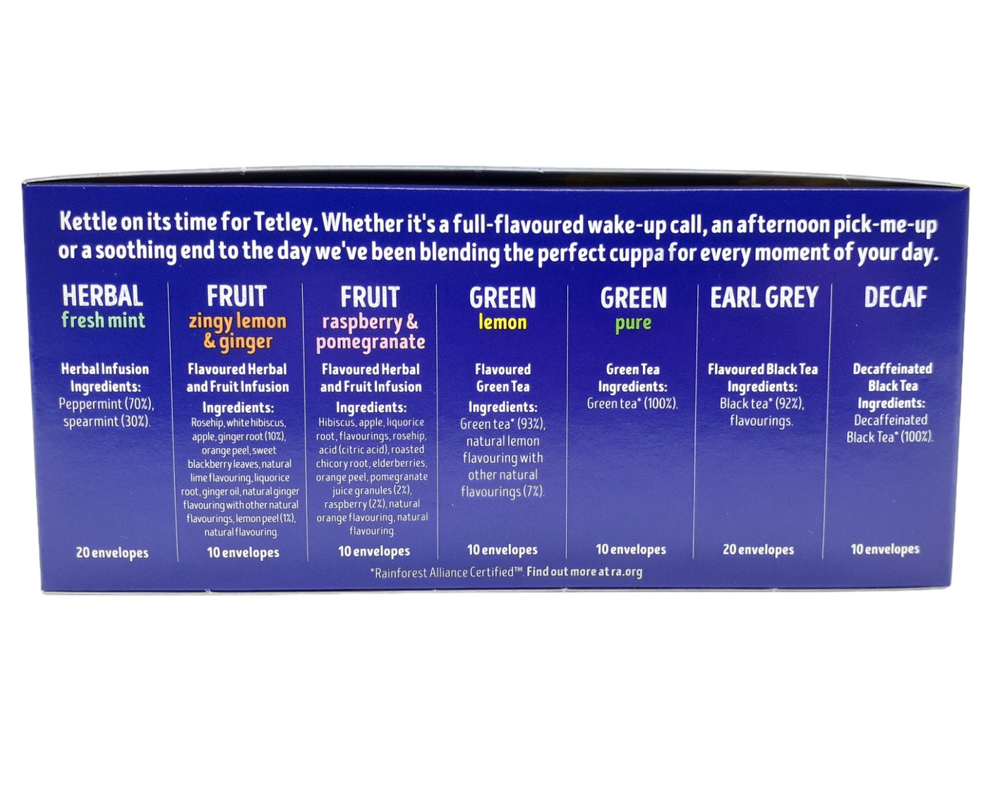 A convenient Tetley selection of 90 individually wrapped (enveloped) string & tag tea bags in a countertop display box. Ideal for home, office, catering, hotels, meetings and gifts.